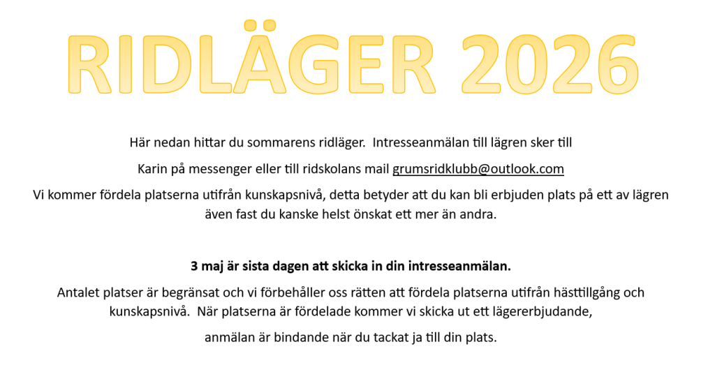 Klicka HÄR för att skicka in din intresseanmälan (om du inte kan skicka in via länken – maila grumsridklubb@outlook.com) Oftast får man svar inom 2 veckor. Detta är för att vi inte alltid har kontoret bemannat utan vi jobbar ute i stallet/har lektioner.